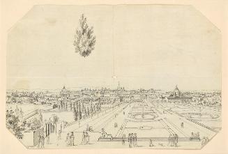 The image depicts a garden landscape with a view of a city. In the foreground, there are gardening elements like bushes and hedges. There are sculptures integrated into the scene. A figure in historical attire stands on a path that runs through the garden. In the background, the city extends with buildings and a church tower rising into the sky. The sky is overcast with clouds.