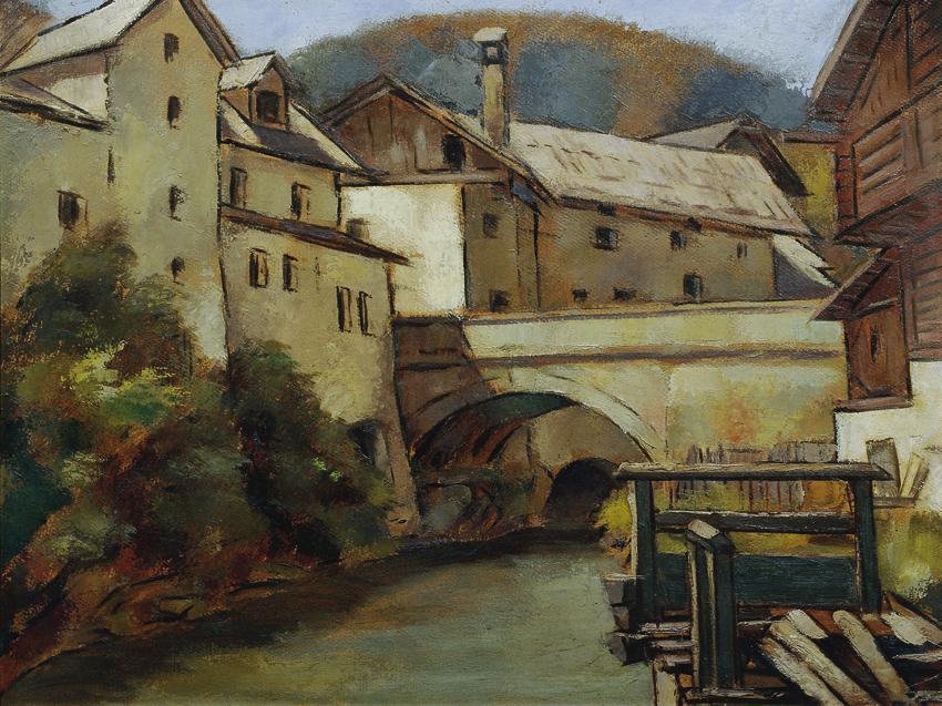 Anton Hula, Ansicht einer Stadt mit Fluss und Brücke, um 1940, Öl auf Karton, 52 x 61,5 cm, Belvedere, Wien, Inv.-Nr. 9632