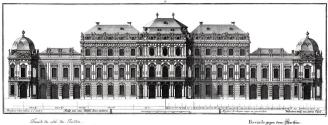 Salomon Kleiner, Facciade gegen dem Garthen, 1736, Radierung, Plattenmaße: 30,6 x 76,6 cm, Belvedere, Wien, Inv.-Nr. BB_1012-046