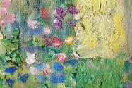 Die Ausarbeitung des Werks mit Ölharzfarben geschah zunächst mit dünnflüssigem Farbauftrag und unterschiedlich breiten Pinseln. In vielen Bereichen wurden dabei absichtlich die Grundierung und die Unterzeichnung sichtbar gelassen, damit sie in die Bildwirkung miteinfließen können. Zum Teil wurde die Unterzeichnung sogar nachträglich vom Künstler nachgezogen – ein deutliches Zeichen für die Relevanz der Zeichnung als Gestaltungselement (Abb. 2). Auf die dünnen Ölharzfarben legte Klimt anschließend sehr pastose Details wie z. B. Blüten oder Blätter. Diese setzte er gekonnt mit wenigen Pinselstrichen auf die Leinwand (Abb. 3). Die Farben hierfür mischte er bereits auf seiner Palette.