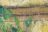 Aus neu publizierten Quellen geht allerdings hervor, dass Klimt im Sommer 1910 offenbar kein einziges Landschaftsbild beginnen konnte, da er ausschließlich mit den dringend benötigten Entwürfen für den Stocletfries beschäftigt war.[11] Gerade dieser Zeitraum zwischen 1909 und 1911 war allerdings eine Zeit der künstlerischen Neuorientierung. Klimt vollzog einen bewussten Bruch mit dem Stil seiner Goldenen Periode und entwickelte den offeneren und expressiveren Stil der späten Jahre. Die Entwicklung seines Stils bis 1909 zeigt ihren Höhepunkt im Gemälde Park (Durchblick) (Abb. 5). Fünf Sechstel der Bildfläche nimmt die Blätterwand der Baumkronen ein, die als ein flaches Muster aus kleinen, runden, gleichförmig angeordneten Farbflecken in Grün und Blau gestaltet ist. Die Farbe ist dabei sparsam und dünn aufgetragen, die einzelnen Farbflecken hauptsächlich nebeneinander und selten überlappend aufgesetzt. Nach 1910 wird dagegen vor allem in den Landschaften eine intensive Beschäftigung mit neuen Vorbildern wie Vincent van Gogh oder Paul Cézanne spürbar.[12] Die Farbflecken werden größer und unregelmäßiger aufgetragen, dicke Umrisse in schwarzer oder blauer Farbe grenzen nun häufig die Bildgegenstände voneinander ab, Farbe wird stellenweise sehr pastos aufgetragen und Klimts Vorliebe für völlig parallel zur Bildfläche angelegte Kompositionen wechselt nun teilweise mit Perspektiven in starker Tiefenflucht oder betont schräg gestellten Motiven ab. Besonders gut nachvollziehbar ist das in einem Werk wie Allee zum Schloss Kammer mit seiner starken Tiefenperspektive der Allee, den breit mit dem Pinsel gezogenen blauen Umrisslinien der Bäume, dick aufgetragener Farbe in See, Himmel und der Mauer des Schlosses sowie einem sehr lockeren und ungleichförmigen Farbauftrag in den Bäumen (Abb. 6).[13] Tatsächlich sind auch in Schloss Kammer am Attersee III die Merkmale dieses neuen Stils bereits zu finden, so etwa der pastose Farbauftrag bei der Schlossfassade, im Himmel und teilweise auch im Laubwerk der Bäume, das zudem viel ungleichförmiger gemalt ist als in den früheren Gemälden von 1908 und 1909 (Abb. 6) (Abb. 7) (Abb. 8) (Abb. 9).