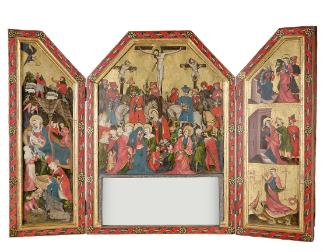 Schüler Rudolf Bachers, Altarretabel, vor 1912, Öl und Tempera auf Holz, teilweise vergoldet, Mittelteil: 211 × 154 cm, Flügel je: 211 × 68 cm, Belvedere, Wien, Inv.-Nr. 7461