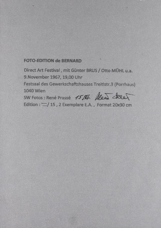 • 15 Schwarzweiß-Fotografien vom Direct Art Festival, 9. November 1967 im Festsaal des Gewerkschaftshauses Treitlstr. 3 (Porrhaus), Wien