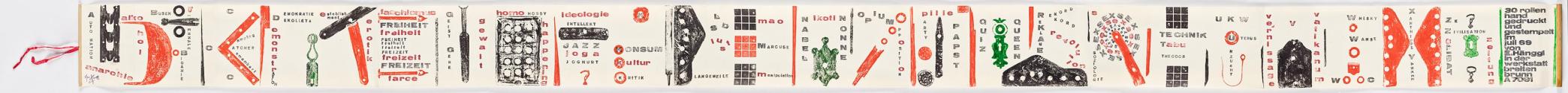 Eduard Hänggi, Von A bis Z (Alphabetbuchrolle), 1969, Materialdrucke und Handstempel, gerollt, in geätzter Metallhülle, Rolle: 33 × 7,5 × 7,5 cm, Schenkung Fria Elfen, Breitenbrunn, Belvedere, Wien, Inv.-Nr. 11676