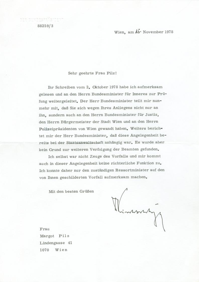 Margot Pilz, Brief Bundespräsident, 1978, Schreibmaschine und Kugelschreiber auf Papier, 29,7 × 21 cm, Belvedere, Wien, Inv.-Nr. 11782/1