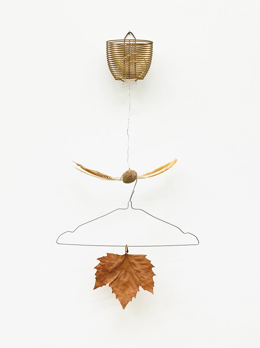 Lois Weinberger, Idee eines Gartens, 1979/1997/2019, Metallkorb, Wirbelsäule einer Schlange, Draht, Kartoffel, Hühnerfedern, Kleiderbügel, Ahornblatt, Höhe: 95 × 41,5 cm, Belvedere, Wien, Inv.-Nr. 11963