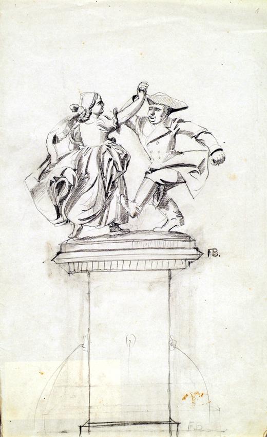 Franz Barwig d. Ä., Tanzendes Bauernpaar (Entwurf für den Brunnen von Nový Jičín/Neutitschein, 1929), um 1928/1929, Bleistift auf Papier, 34 x 21 cm, Belvedere, Wien, Inv.-Nr. 9188