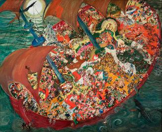 The image depicts a large, intricately detailed ship navigating through turbulent waters. The ship features colorful sails and is surrounded by many figures. There are numerous people and creatures represented both on the ship and in the water, engaged in various activities and poses. The scene appears lively and chaotic, with many different vignettes coexisting alongside each other, including festivities and conflicts. In the background, a large moon is visible.